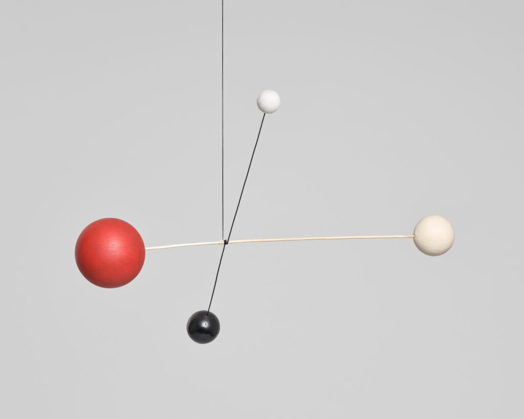 Following a visit in October of 1930 to Piet Mondrian’s studio, where he was impressed by the environmental installation, Calder made his first wholly abstract compositions and invented the kinetic sculpture now known as the mobile. Coined for these works by Marcel Duchamp in 1931, the word “mobile” refers to both “motion” and “motive” in French. He also created stationary abstract works that Jean Arp dubbed “stabiles.”