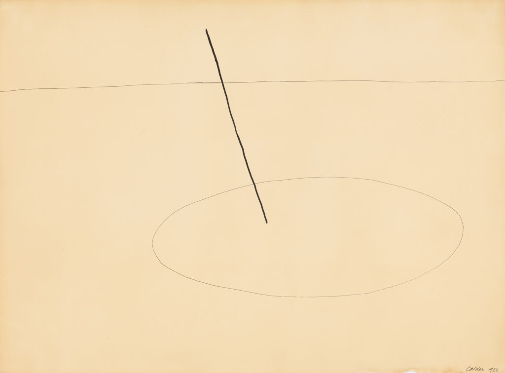 Following a visit in October of 1930 to Piet Mondrian’s studio, where he was impressed by the environmental installation, Calder made his first wholly abstract compositions and invented the kinetic sculpture now known as the mobile. Coined for these works by Marcel Duchamp in 1931, the word “mobile” refers to both “motion” and “motive” in French. He also created stationary abstract works that Jean Arp dubbed “stabiles.”