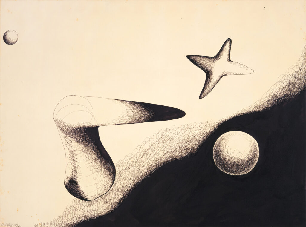 Solo ExhibitionFollowing a visit in October of 1930 to Mondrian’s studio, where he was impressed by the environment and actuation of space, Calder made his first wholly abstract compositions and developed the kinetic sculpture now known as the mobile. Coined for these works by Marcel Duchamp in 1931, the word “mobile” refers to both “motion” and “motive” in French. He also created stationary abstract works that Jean Arp dubbed “stabiles.”
